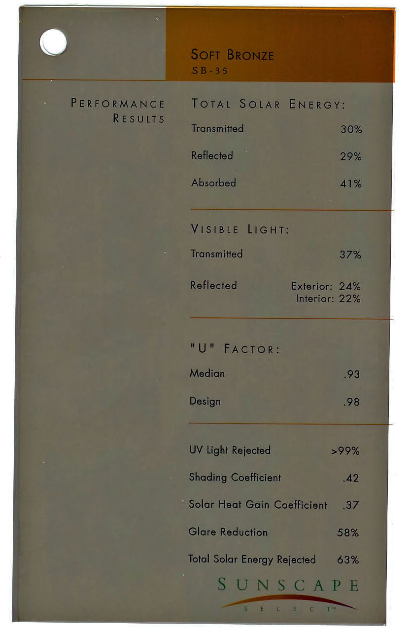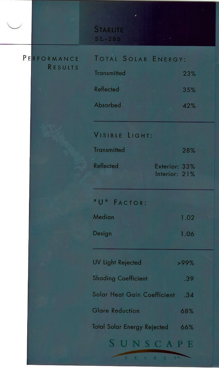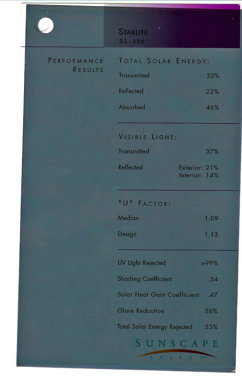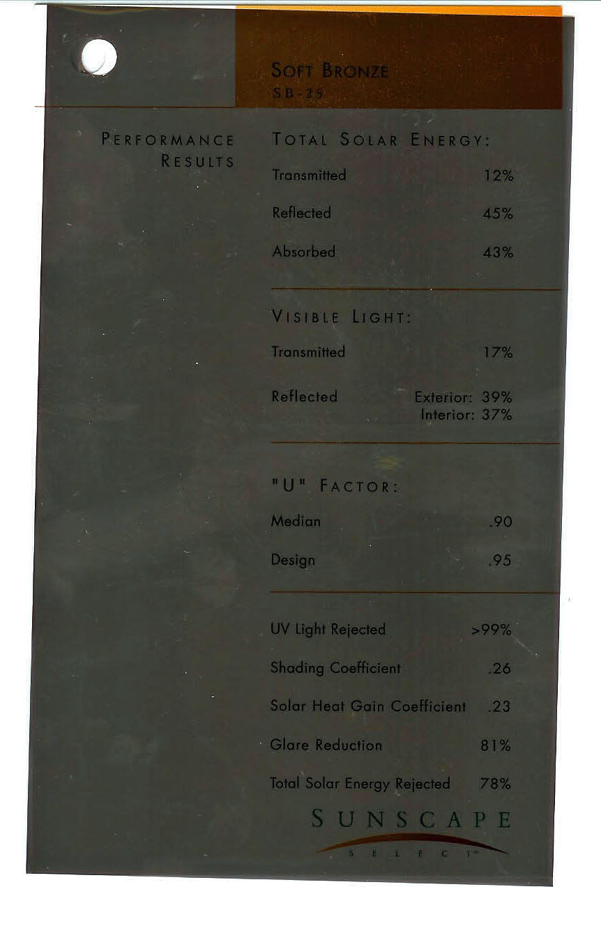 Description / Transmitted Reflected / Transmitted Reflectance Absorbed / Total Solar Energy Rejected / UV Rejection
