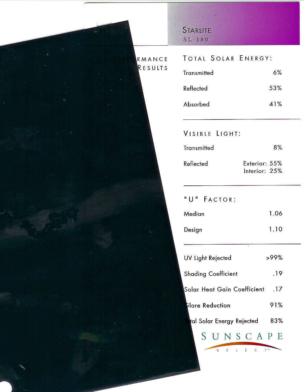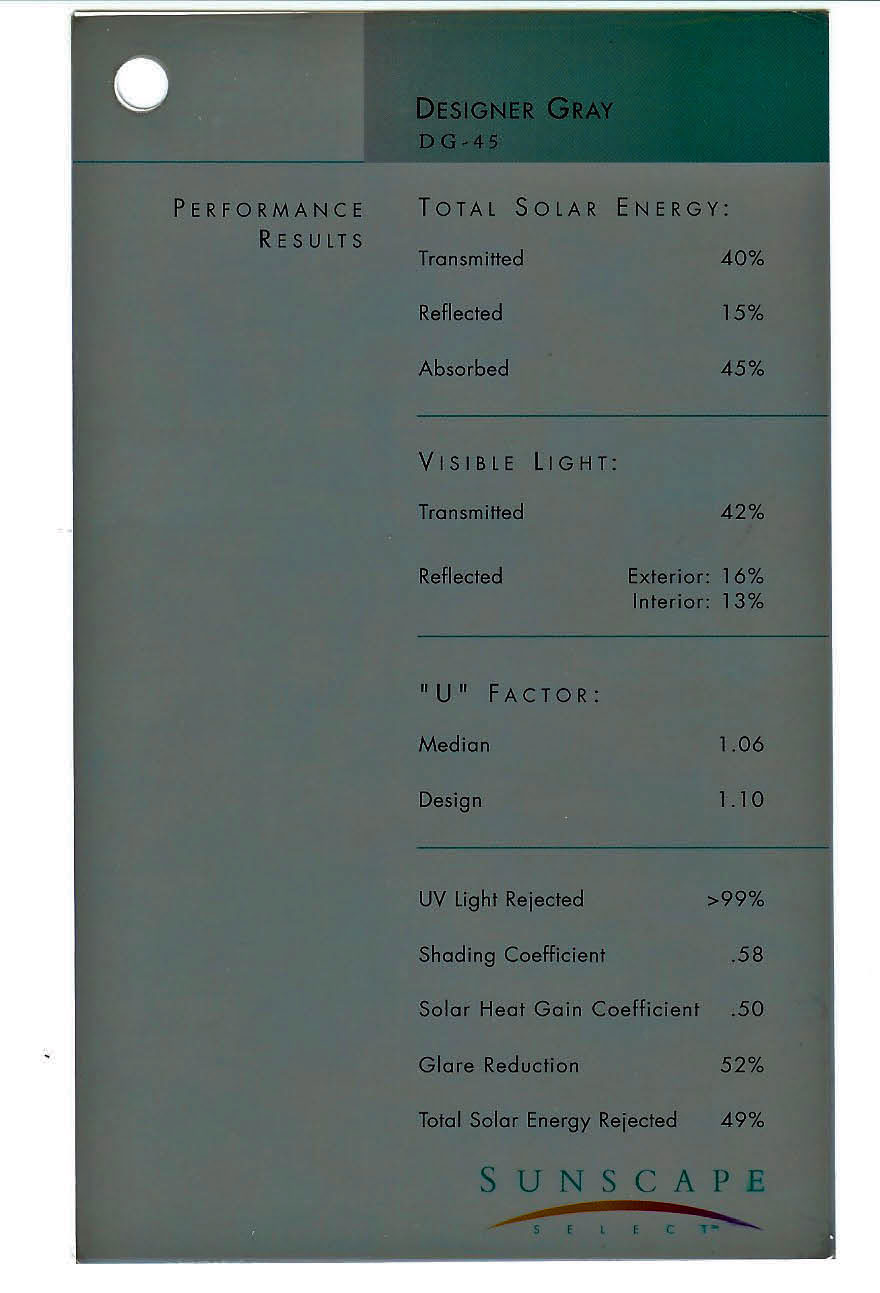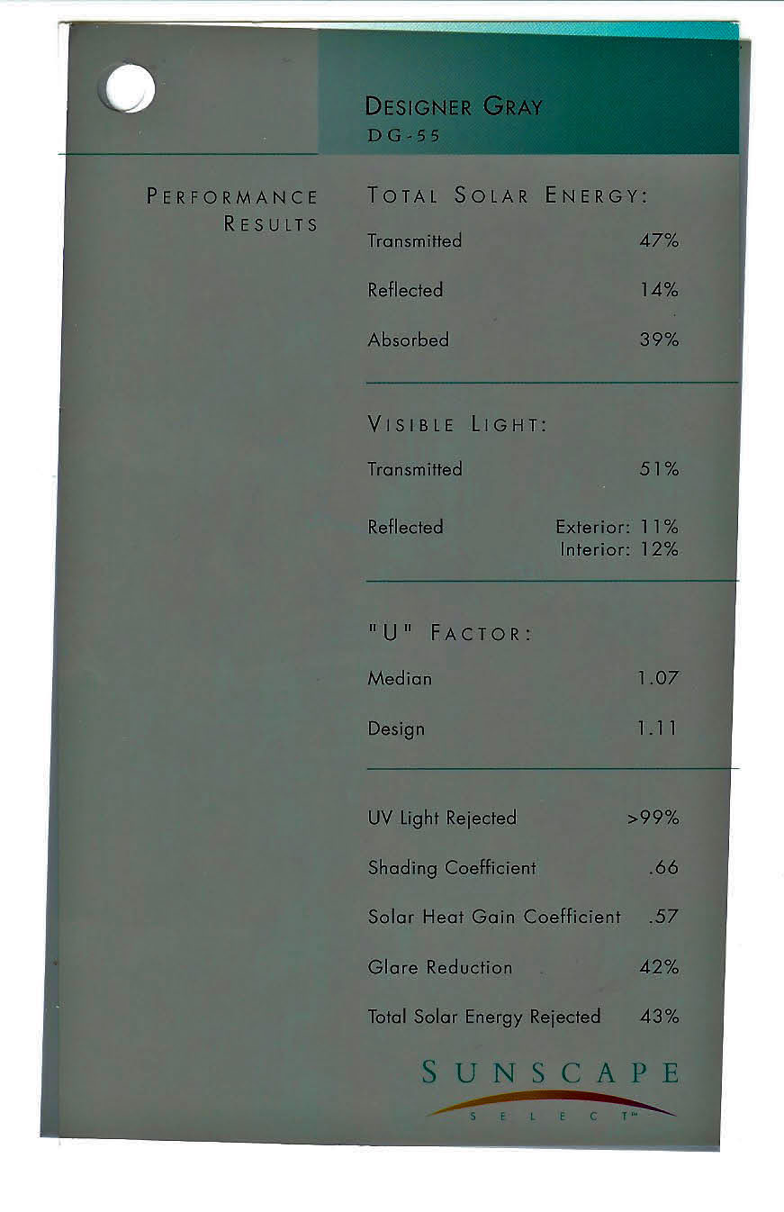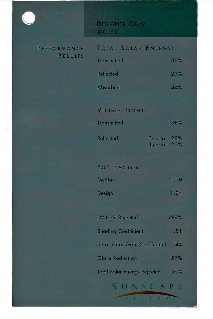Description / Transmitted Reflected / Transmitted Reflectance Absorbed / Total Solar Energy Rejected / UV Rejection